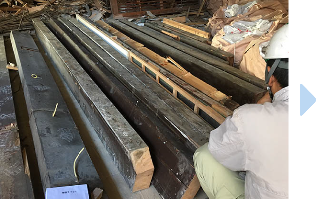 既存建物の調査を行いながら解体を進め、材料選定、埋蔵文化財の調査を経て、建築工事に着手しました。築100年超の京町家をホテルとして機能再生して長く使うために、生かし取り(※2)材の腐朽修復などが必要な箇所を見定め、一つひとつを修復加工して新設建屋に取り込みました。