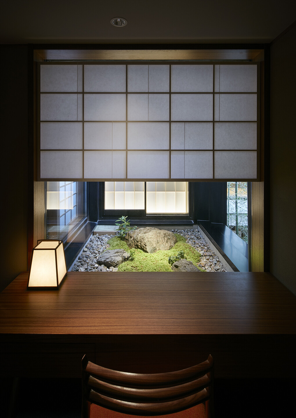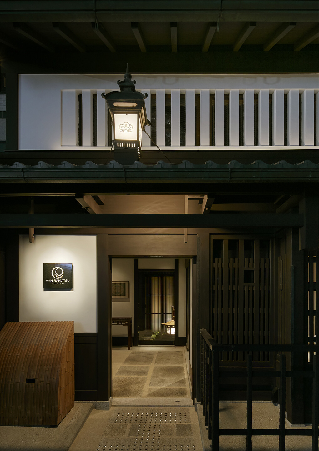 THE HIRAMATSU 京都は、そのような立地にあり、伝統的な京町家を保存・再生して2020年に誕生したホテルです。「はんなり」という言葉に象徴される、京の町で培われてきた美意識と空気感の継承を計画の中心に据え、京町家の平面構成を踏襲し、町家建築の光と風、緑の演出要素を最大限に引き出しました。また、仕上げには木材や土壁、和紙など、京都らしい素材を多用し、昔ながらの人の手技の力を頼りに空間をつくりあげていきました。